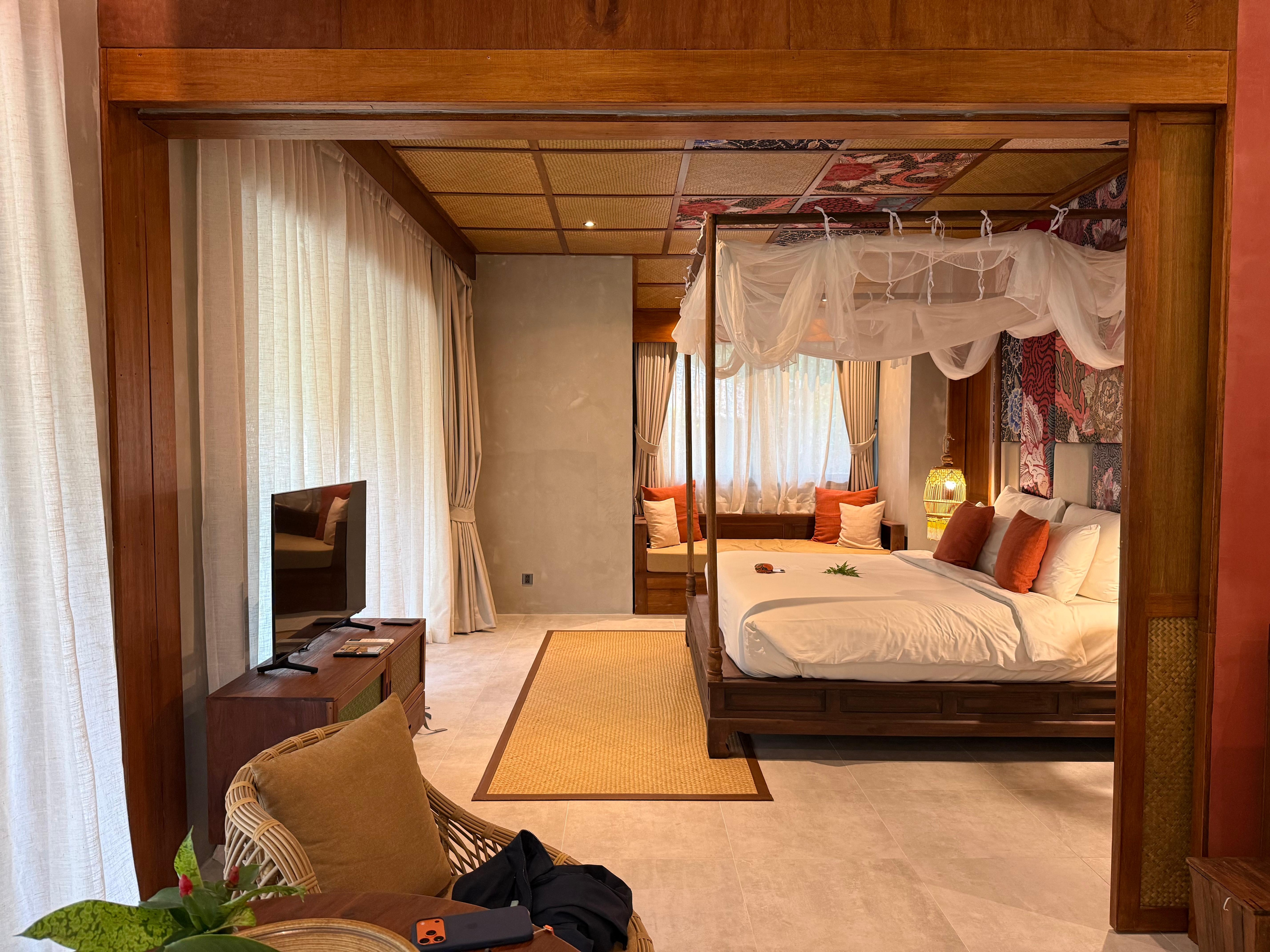 Grote kamer/villa met binnen en buiten douche. Midden in de jungle dus geen verkeer maar vooral vogels en cicaden. Prachtig. Villa ligt op een heuvel dus stukje naar boven lopen maar als je minder ter been bent brengen ze je met een golfkarretje iveral heen